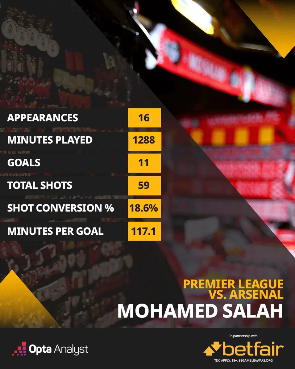 【萨拉赫对阵阿森纳的关键数据】